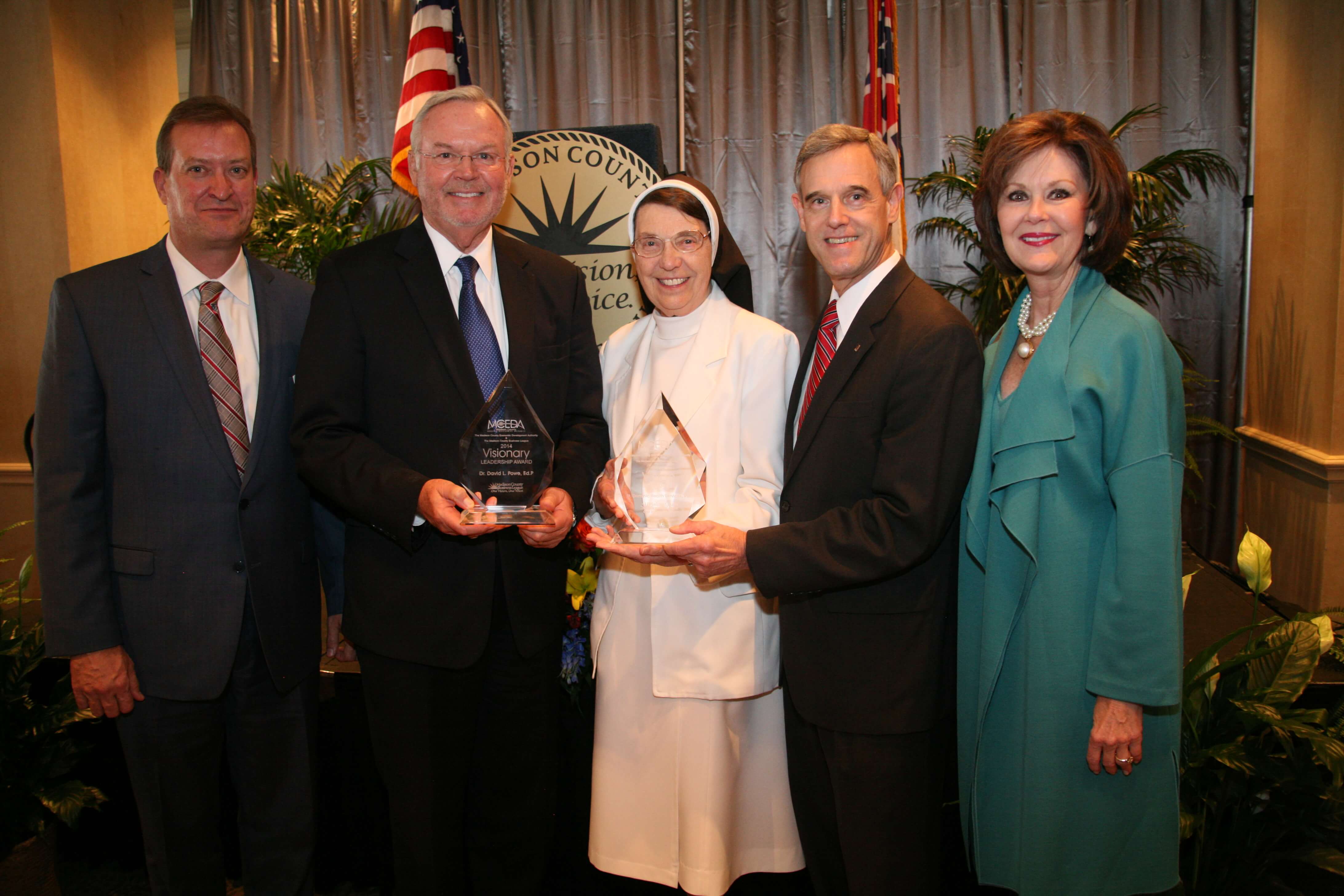The 2014 VISION Award was presented to St. Dominic Health Services, Inc. Claude Harbarger, President of St. Dominic Health Services, Inc. accepted the award from Donna Sims, president of BankPlus – Madison County Division, the 2013 Vision Award winner. The 2014 VISIONARY Leadership Award was presented to Dr. David Powe, Ed.D., by MCEDA Executive Director Tim Coursey.