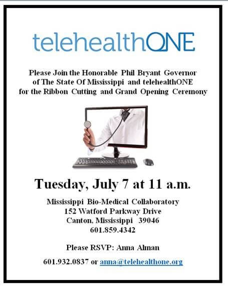 Governor Phil Bryant will be on hand at the ribbon cutting for TelehealthONE on Tuesday, July 7th at 11:00 am. TelehealthONE is located at MCEDA’s new Mississippi BioMedical Business Collaboratory at 152 Watford Parkway Drive, Canton. Watford Parkway is located just off I-55 at Nissan parkway West (exit 118B). Please join us as we celebrate Mississippi’s first private telehealth company.